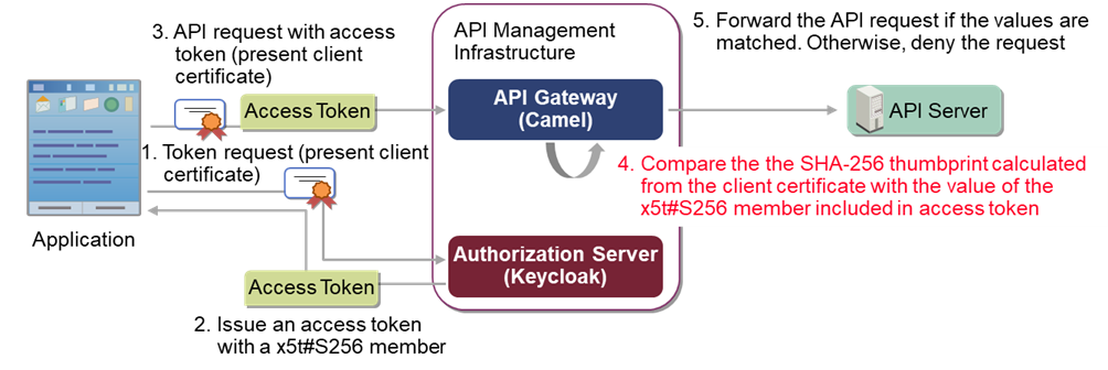 After receiving an API request with the client certificate, API manager infrastructure can compare the SHA-256 thumbprint of the client certificate and the value of the cnf.x5t#S256 member in the access token. If they are not matched, the API request will be denied.
